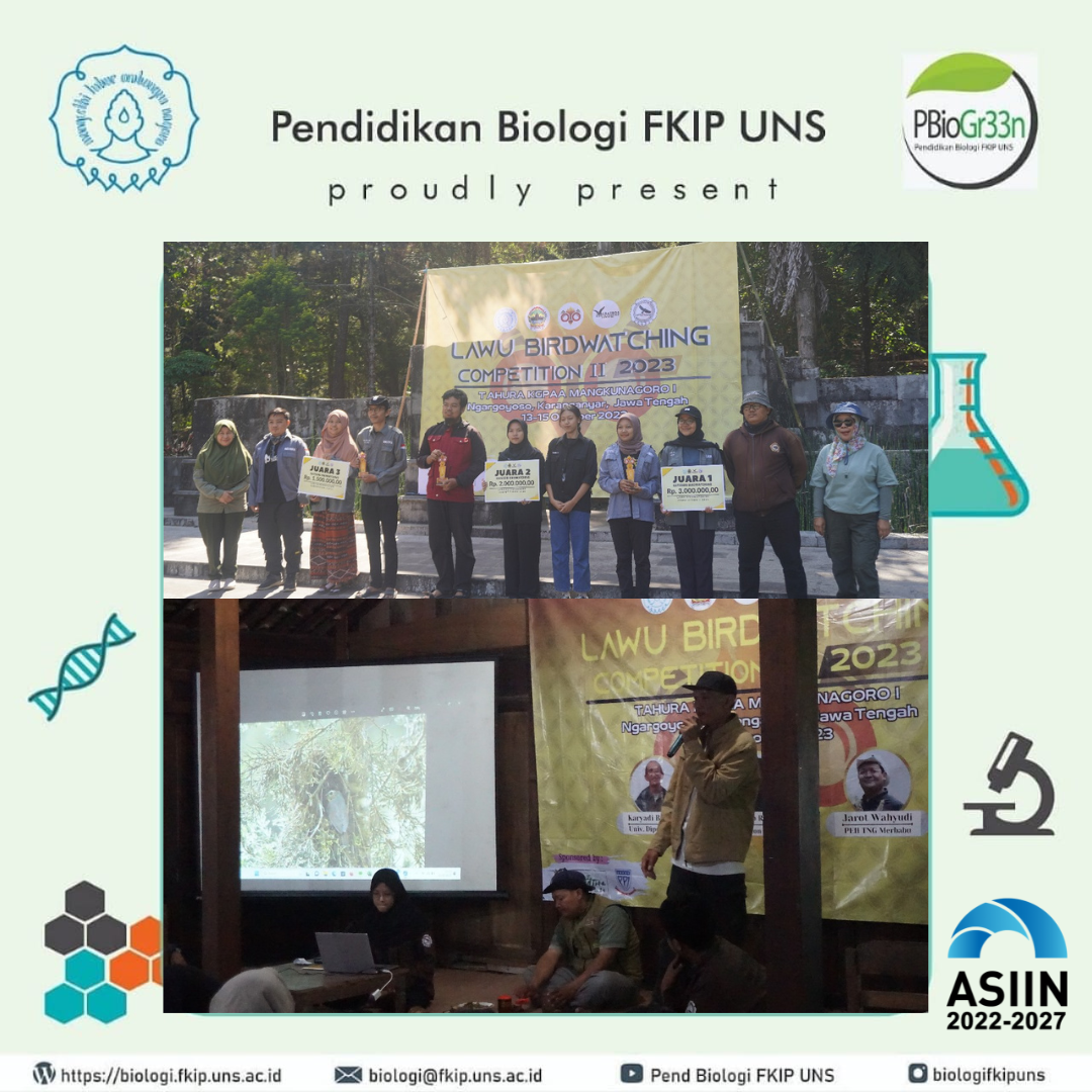 On Sunday, 15 October 2023 at 10:00 a.m. located in TAHURA KGPAA Mangkunagoro I, Ngargoyoso, Karanganyar, board of jury of photography field Lawu Birdwatching Competition II 2023, were decided: Ifan Syahputra as first winner from Pelatuk BSC team of Semarang State University, Dwi Aji Wicaksana as Second winner from Pelanduk Semak team of Airlangga university, Zulaima Rakhmatiar as Third winner from Mbrondol of KP3 Burun Forestation Gadjah Mada University, Ikmal Maulanal Huda was the Fourth winner from the Males Mikiri team of Sahabat Hayat and Alfian Surya from the Klandestin team as the Five winner from KPB Bionic Yogyakarta State University. Furthermore, the board of jury to identify the bird field at Lawu Birdwatching Competition II 2023, was decided: team 18 Meninting from UIN Sunan Kalijaga was the first winner, team 22 Pelatuk BSC from Semarang State University was the second winner and Team 16 Males Mikir from Sahabat Hayat was the third winner. “We also appreciated Zayna Arsyila Muhammad as a younger participant of this competition from sendal jepit team Biology ITS”, concluded the committee.