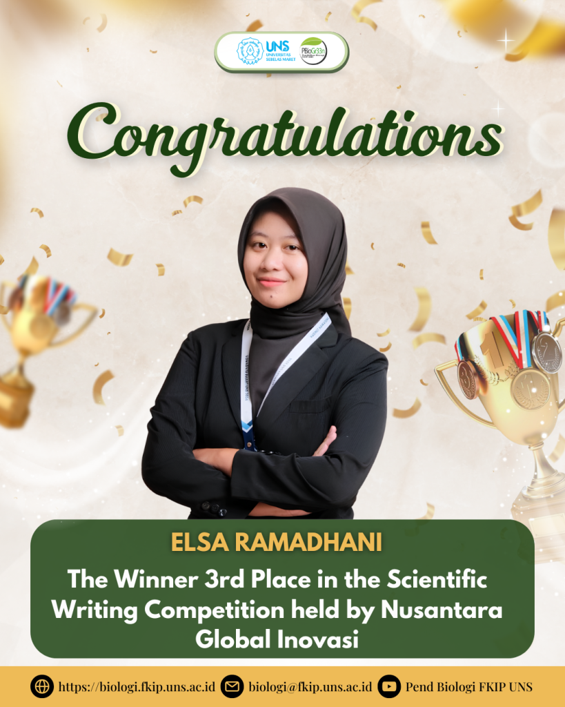 Elsa Ramadhani, a 2023 Biology Education student, has proudly achieved 3rd place in the Scientific Writing Competition held by Nusantara Global Inovasi.