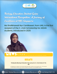SINGAPORE / SURAKARTA – The Biology Education Study Program at Universitas Sebelas Maret (UNS) continues to strengthen its global academic footprint through the remarkable achievements of its students. Recently, the National Institute of Education (NIE) Singapore featured an inspirational essay by Sholikhawati Nur Cantikasari, a Biology Education student who was awarded the prestigious CJ Koh Scholarship.