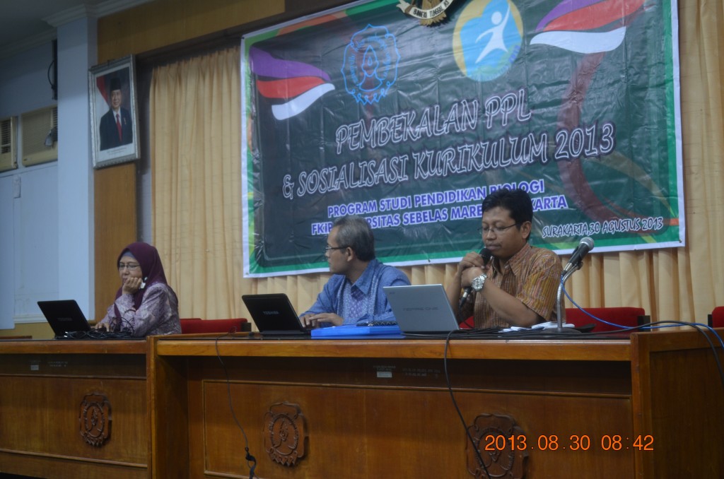 Kurikulum merupakan salah satu standar bagi pencapaian standar kompetensi lulusan. Sifat kurikulum adalah dinamis, karena sifat pengguna yang terus berkembang. Kurikulum 2013 merupakan kurikulum yang telah ditetapkan untuk dilaksanakan di sekolah menengah selaku pengguna lulusan institusi LPTK sebagaimana halnya Pendidikan Biologi FKIP UNS. Dinamika kebutuhan pengguna tersebut diakomodasi oleh Pendidikan Biologi FKIP UNS dengan melaksanakan sosialisasi kurikulum 2013 kepada segenap dosen yang dilaksanakan bersamaan dengan kegiatan sosialisasi kurikulum 2013 dan pembekalan PPL atas mahasiswa yang akan diterjunkan ke sekolah-sekolah mitra terkait dengan PPL tahun 2013.